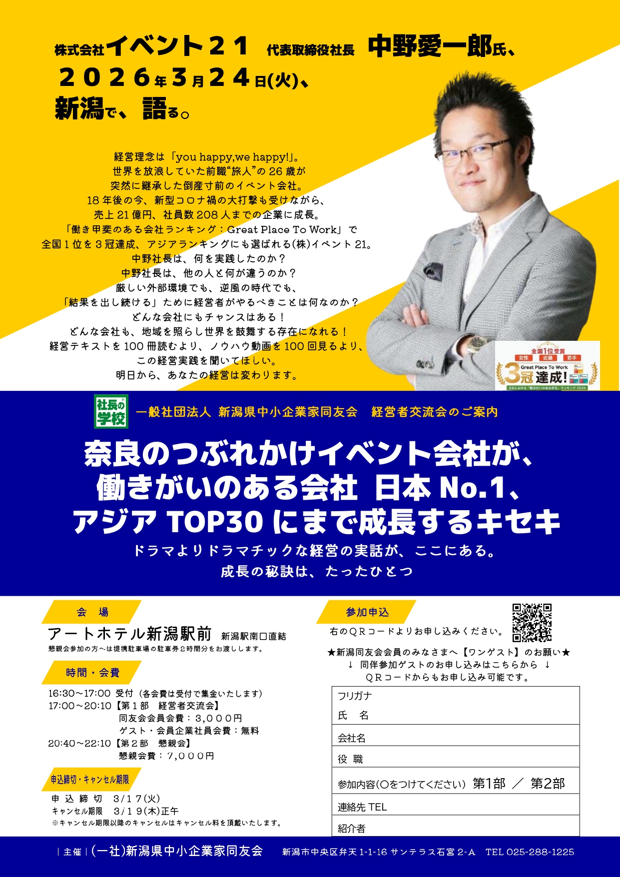 3月24日(火) 経営者交流会ALL新潟「奈良のつぶれかけイベント会社が、働きがいのある会社日本No.1、アジアTOP30にまで成長するキセキ」