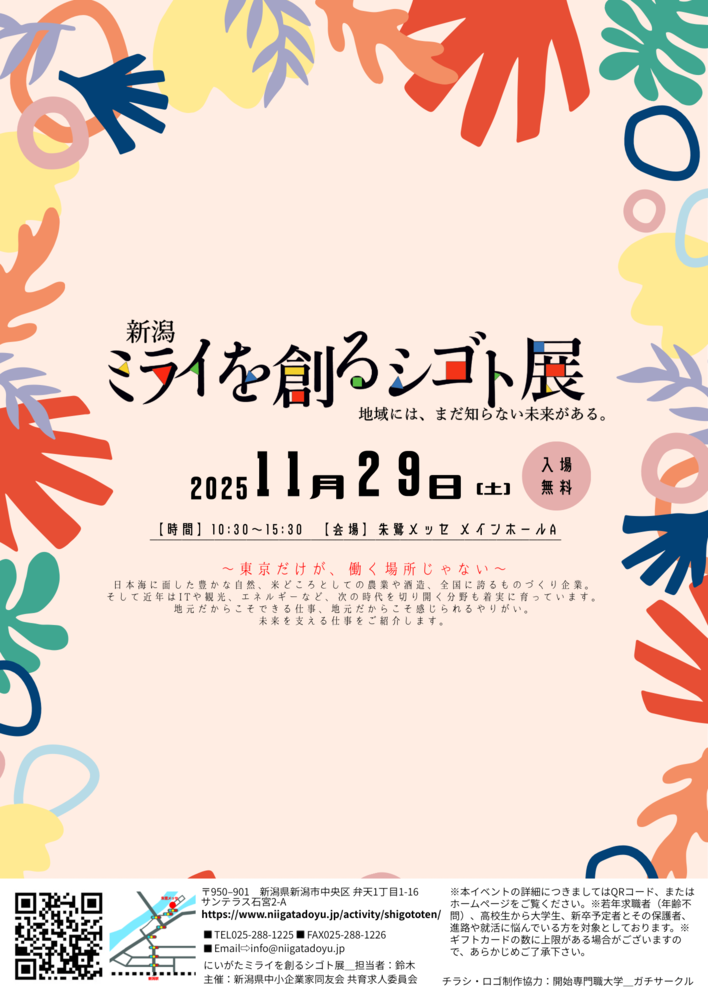 新 潟 ミ ラ イ を 創 る 仕 事 展 』 は 、 地 域 の 未 来 を 担 う 若 者 た ち が 「 働 く 意 味 」 や 「 企 業 の 魅 力 」 を 、体 験 と 対 話 を 通 じ て 実 感 す る 事 の 出 来 る 新 し い ス タ イ ル の イ ベ ン ト で す 。