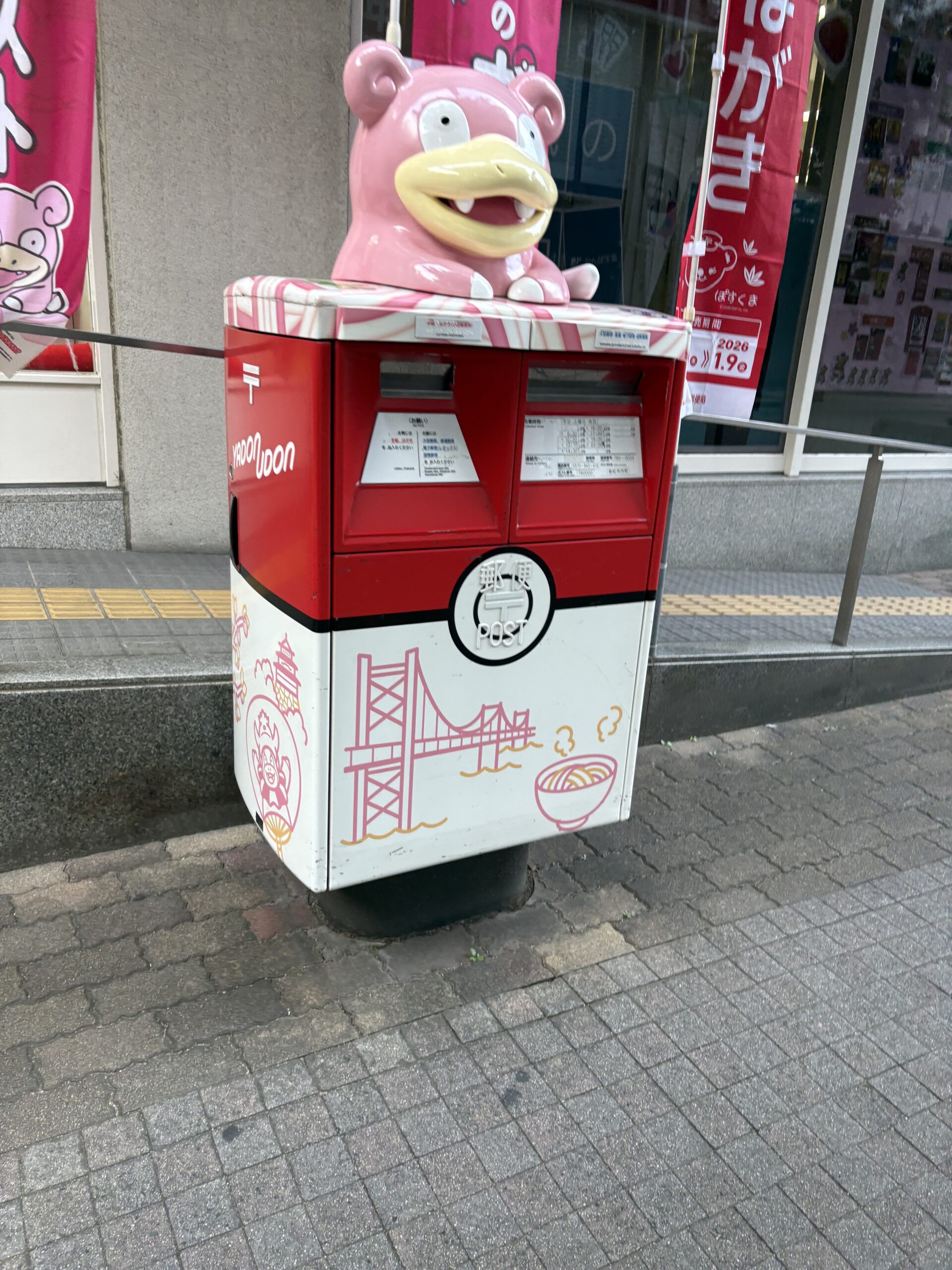翌朝、会場に向かうまでの郵便局前のポストもモンスターボールとヤドン。